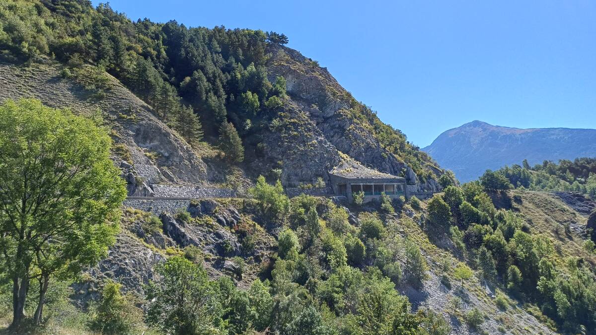 J'oserais presque dire que la principale difficulté de ce col, c'est de savoir où le prendre à Silvaplana. En effet, la route principale est interdite aux vélos à cause de la présence d'un tunnel de 800 mètres de long. Il faut donc aller au cœur du village et trouver la route qui monte droit au ciel (normal, on est à côté de l'église). Mais il y a tout de même une incertitude puisque cette route est affublée d'un panneau sans issue, mais avec un petit vélo positionné au-dessus de la barre rouge. C'est l'occasion de réviser mon code de la route, où plutôt d'apprendre que le petit vélo nous annonce qu'il y a une issue pour les cyclistes. Vite mettre le tout petit développement pour arriver exténué en amont du tunnel, et enchainer avec une série de lacets bien costauds. Heureusement, tout cela s'apaise bientôt et je retrouve un profil un peu similaire à celui de l'Albulapass franchi ce matin. Avec toutefois, une curiosité qui attire l'œil là où on devine la présence du col : qu'est-ce que cet étrange bâtiment de plusieurs étages, de couleur brun-rouge fait là ?